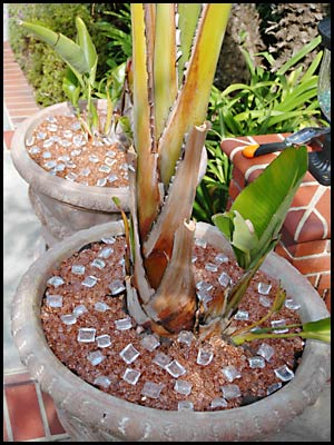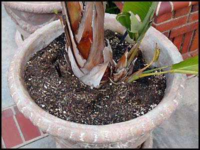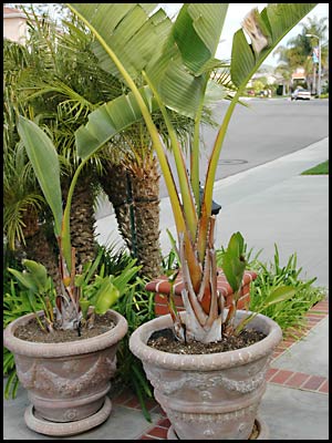 Here are two large pots containing giant bird of paradise.